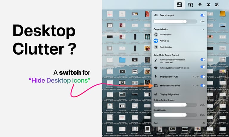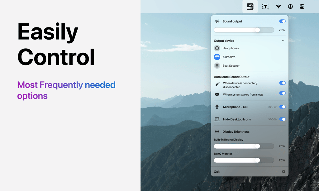 Easily is used to Hide destop icons, control and auto mute output volume and control display brightness .You can customize the keyboard shortcut in the app’s settings.